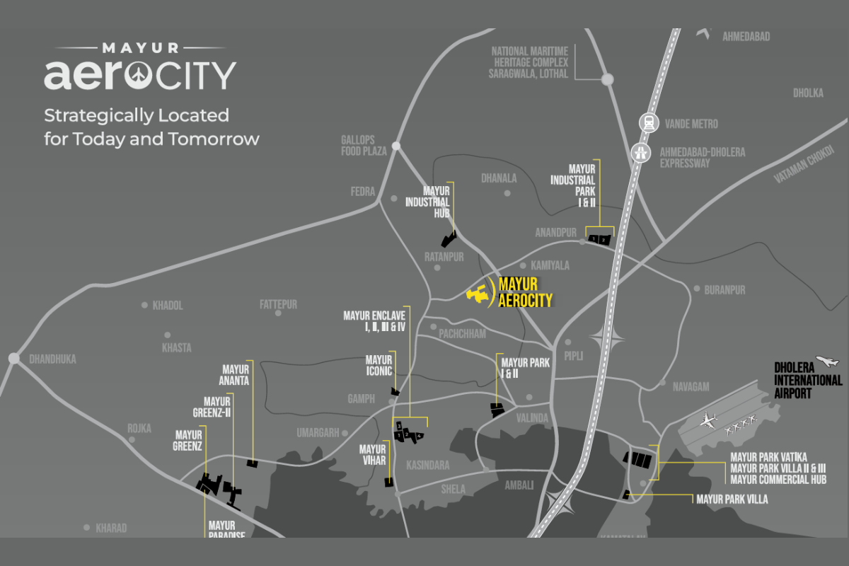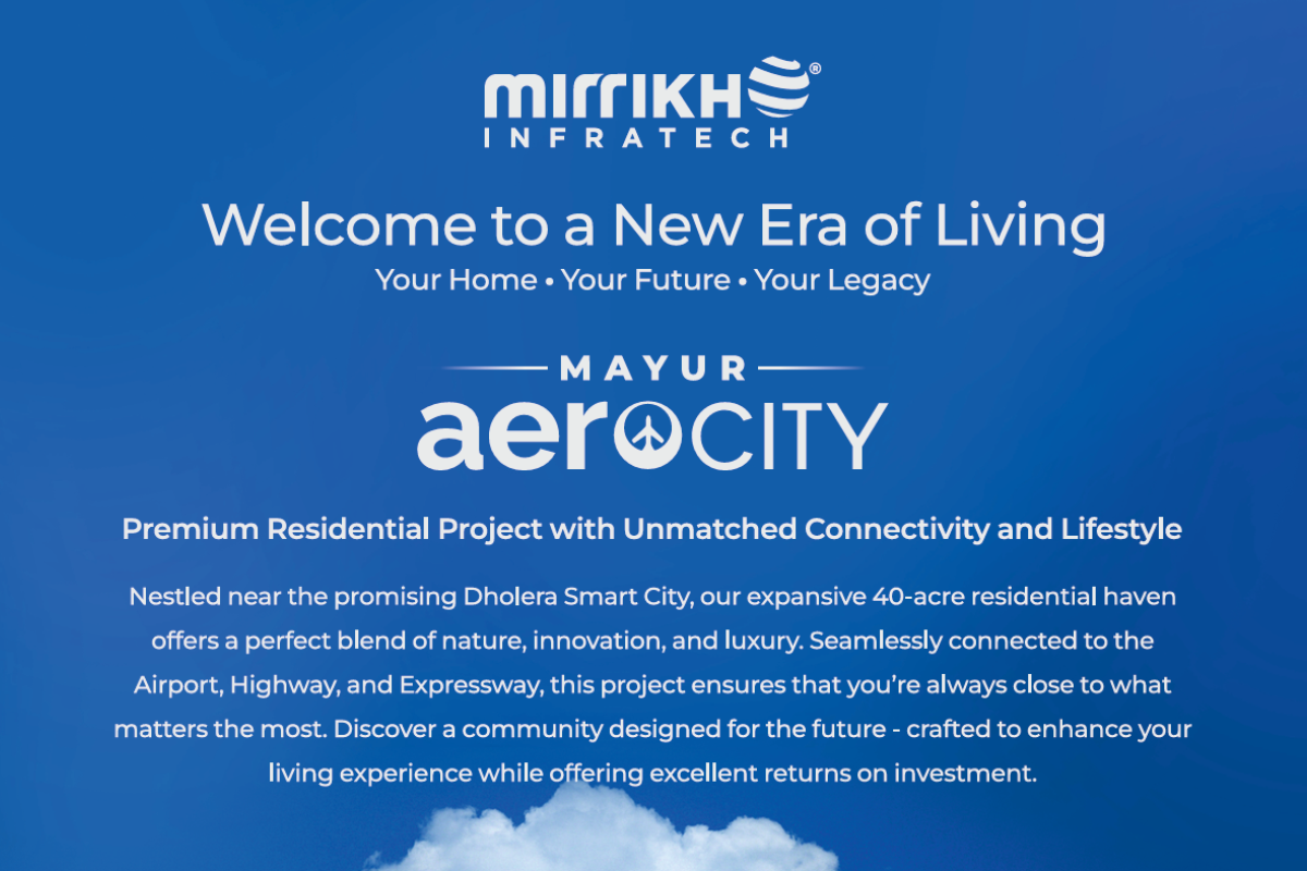 Mayur Aerocity is a premium residential project developed by Mirrikh Infratech, strategically located near the Dholera Special Investment Region (SIR) in Gujarat, India. This development is part of the ambitious Dholera Smart City initiative, envisioned as India's first greenfield industrial smart city under the Delhi-Mumbai Industrial Corridor (DMIC) project.